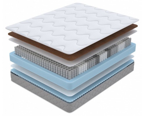 состав слоев:, кокосовая койра - 10 мм, спанбонд, 7-зонный блок независимых пружин EVS 500SS - 140 мм, спанбонд, пена Ortofoam - 20 мм, короб из пены Ortofoam, max вес на спальное место - 110 кг, допустимая разница в весе - 20 кг