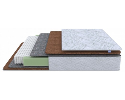 состав слоев:, кокос - 2 см, объемный войлок - 1 см, EVS1000 - 14 см, объемный войлок - 1 см, кокос - 2 см, короб ортофом (ППУ), чехол: трикотаж, простеганный на объемном волокне (280 г/м2) и пене (5 мм), max вес на спальное место: