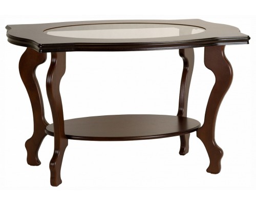 Классический столик в гостиную или спальню. Форма стекла перекликается с формой полочки. Удобная высота столика. Окрашен в темнокоричневый цвет и покрыт надежным лаком, тонированное стекло. Надежно упакован в одну коробку, легко собирается.